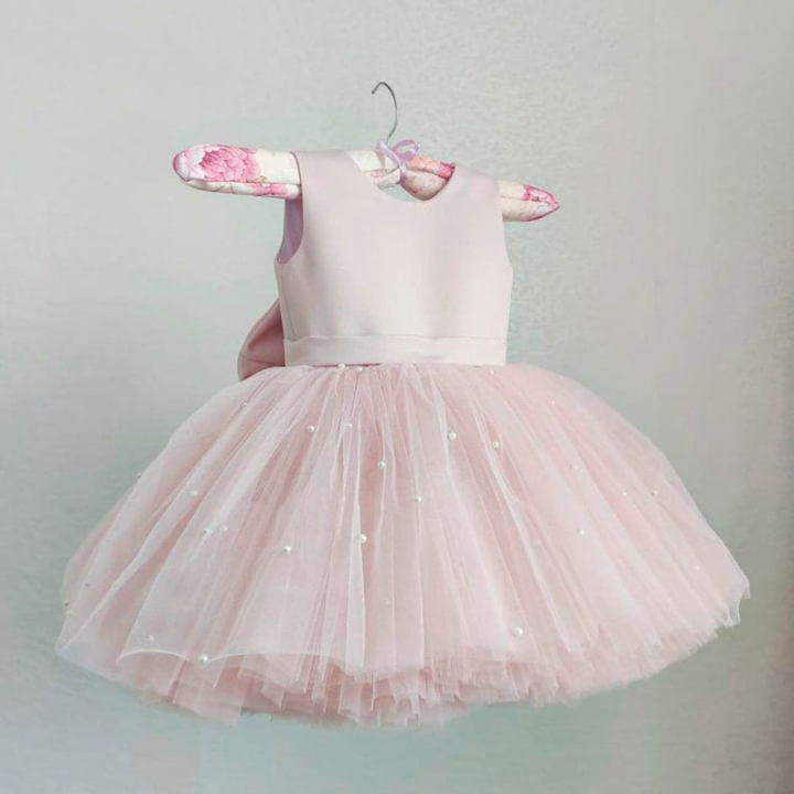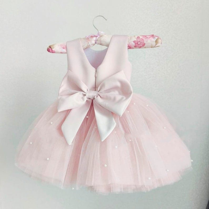 "Blush Petal Pearl Dress – Tulle Party Gown with Oversized Bow"
